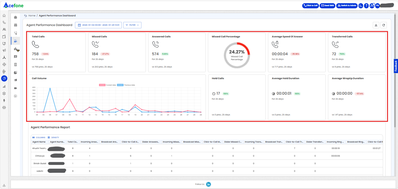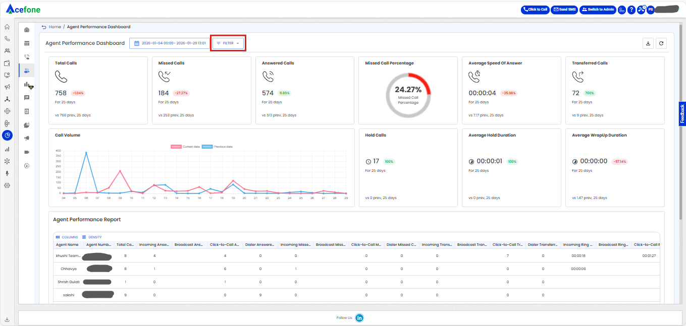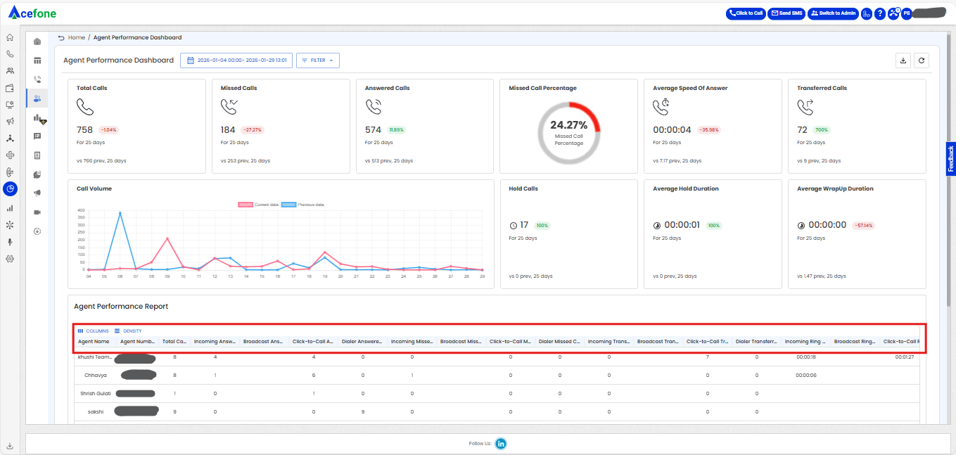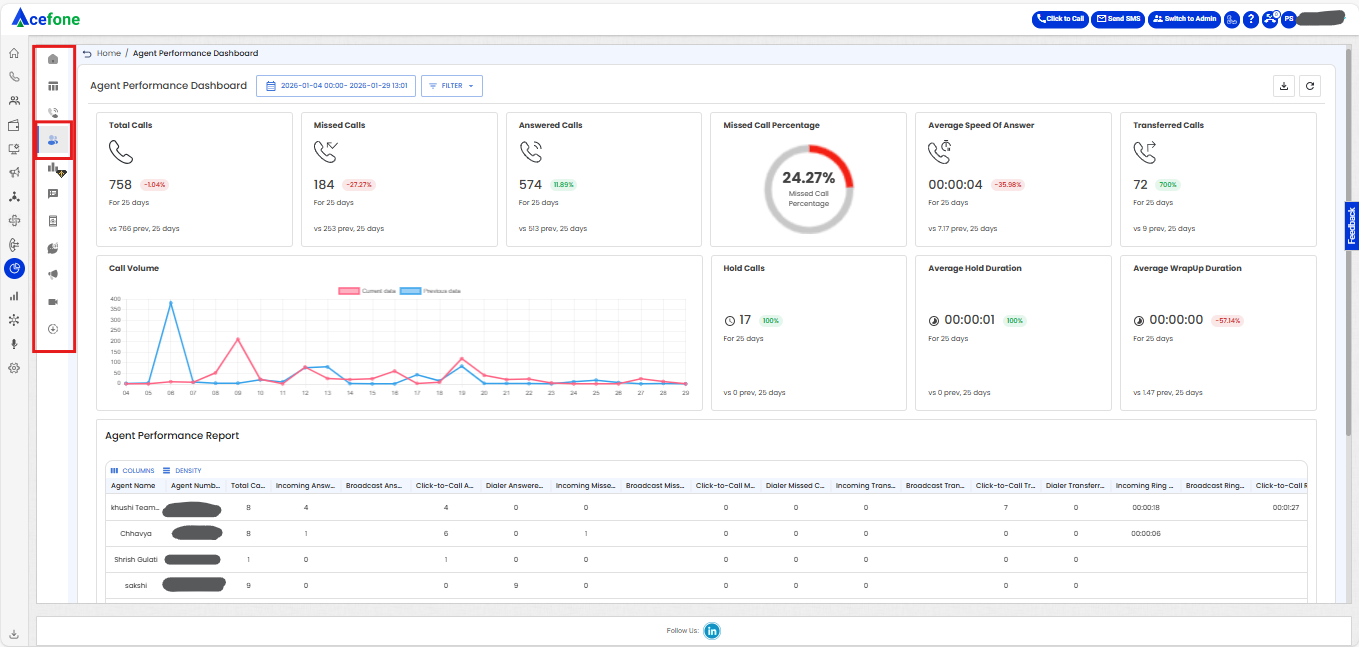 - To access the Agent Performance Dashboard in your Acefone account, first log in using your unique User ID and Password. Once logged in, you will be directed to the main dashboard. From there, locate the navigation menu on the left-hand side of the screen and click on Insights. You will land on the Insights Dashboard; from there, click on Agent Performance Dashboard, which is located just to the right-hand side of the navigation menu on the top-left corner of the screen.