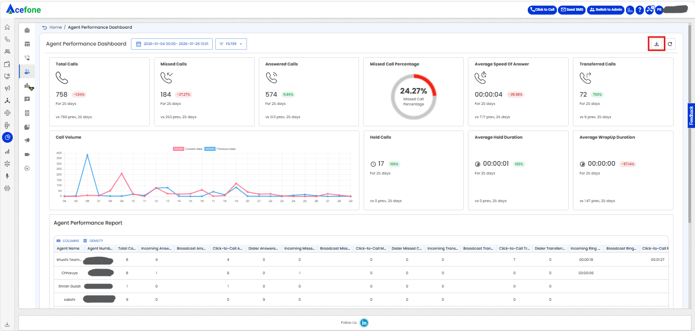- Navigate to the Call Performance Dashboard and click on the Download icon located in the top-right corner (highlighted in the screenshot).
