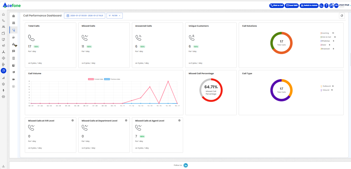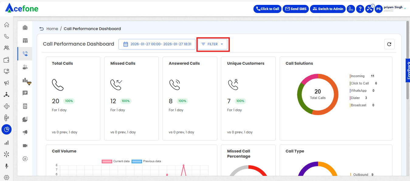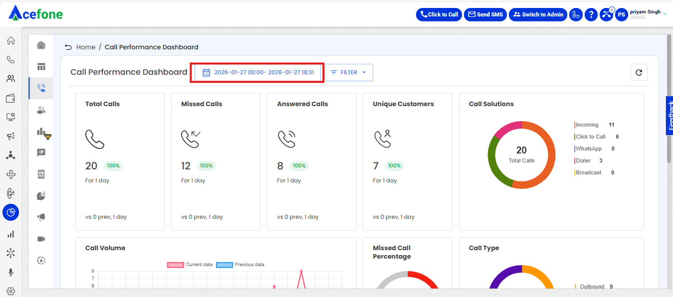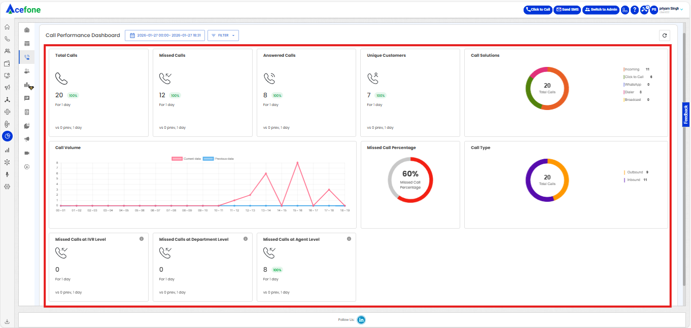 To go to Call Performance Dashboard to your Acefone account, first log in using your unique User ID and Password. Once logged in, you will be directed to the main dashboard. From there, locate the navigation menu on the left-hand side of the screen and click on "Insights". You will land on the Insights Dashboard; from there, click on Call Performance Dashboard, which is located just to the right-hand side of the navigation menu on the top-left corner of the screen.