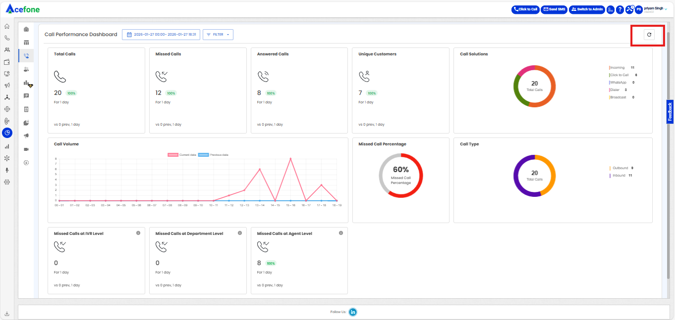 - Refresh options are located in the top-right corner of the Call Performance Dashboard: