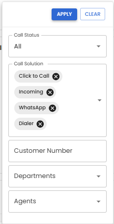 | Call Solution | Filters based on the call solution type, such as Click-to-Call, Incoming, Dialer, or Broadcast. Note: Broadcast can only be selected as a standalone option and cannot be combined with other call types during filtering. |