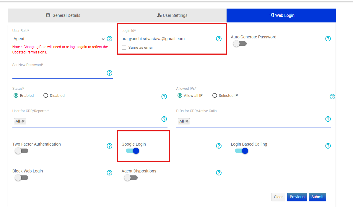 Create a user account using the same login ID and email ID as the user’s Google account. Enable the Google Login toggle for that user.