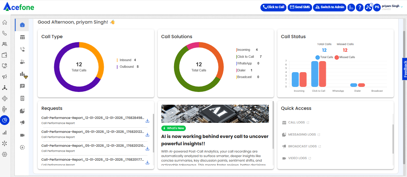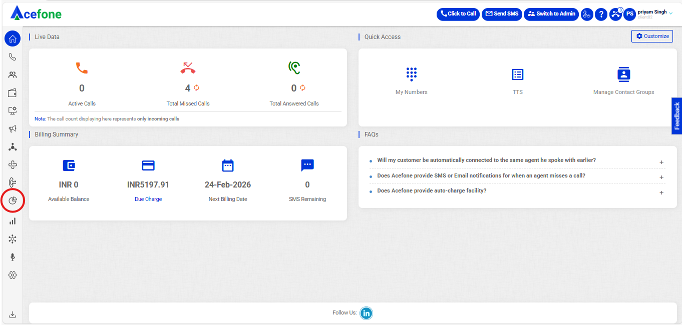 To go to Insights Dashboard to your Acefone account, first log in using your unique User ID and Password. Once logged in, you will be directed to the main dashboard. From there, locate the navigation menu on the left-hand side of the screen and click on "Insights".